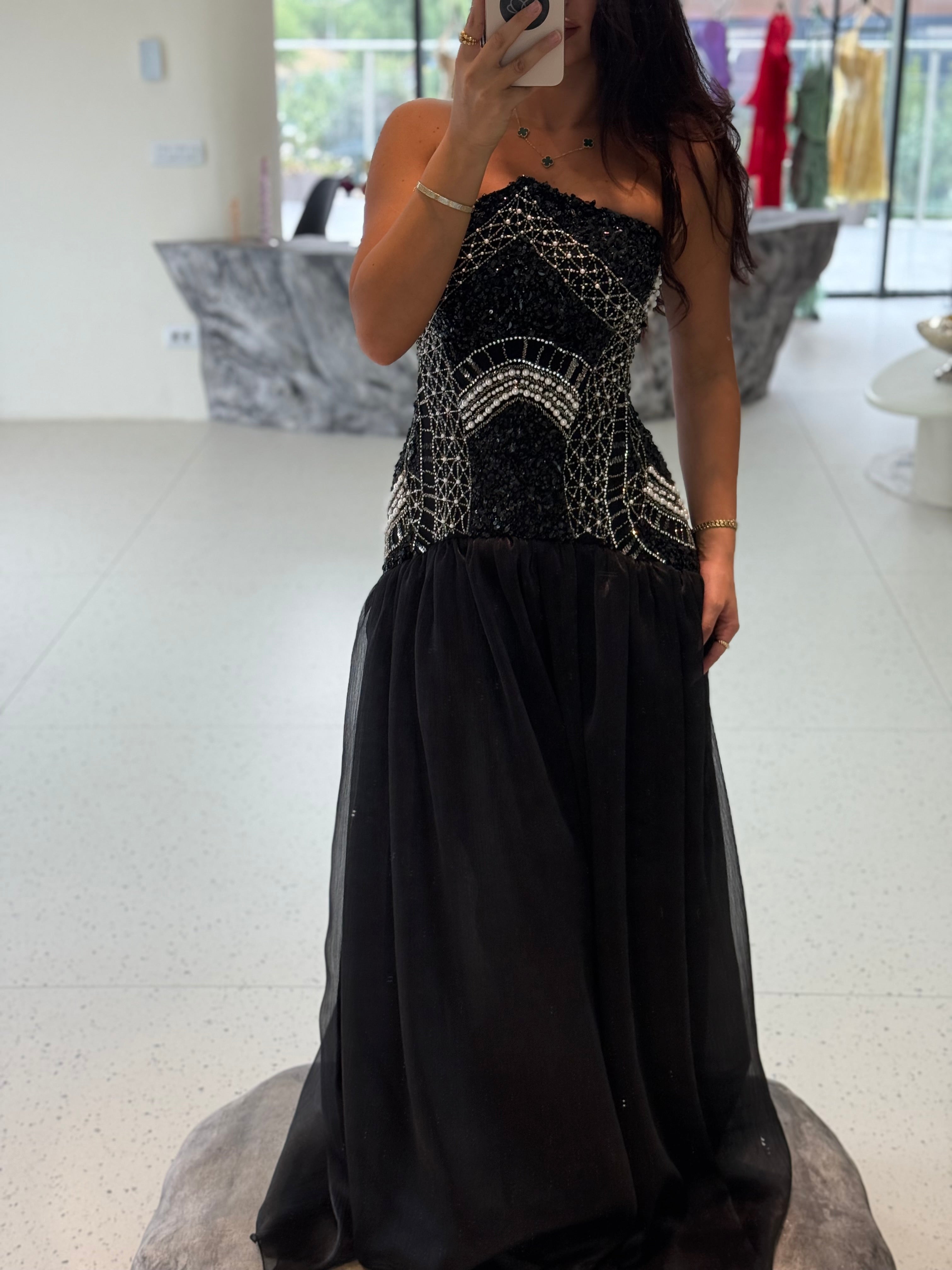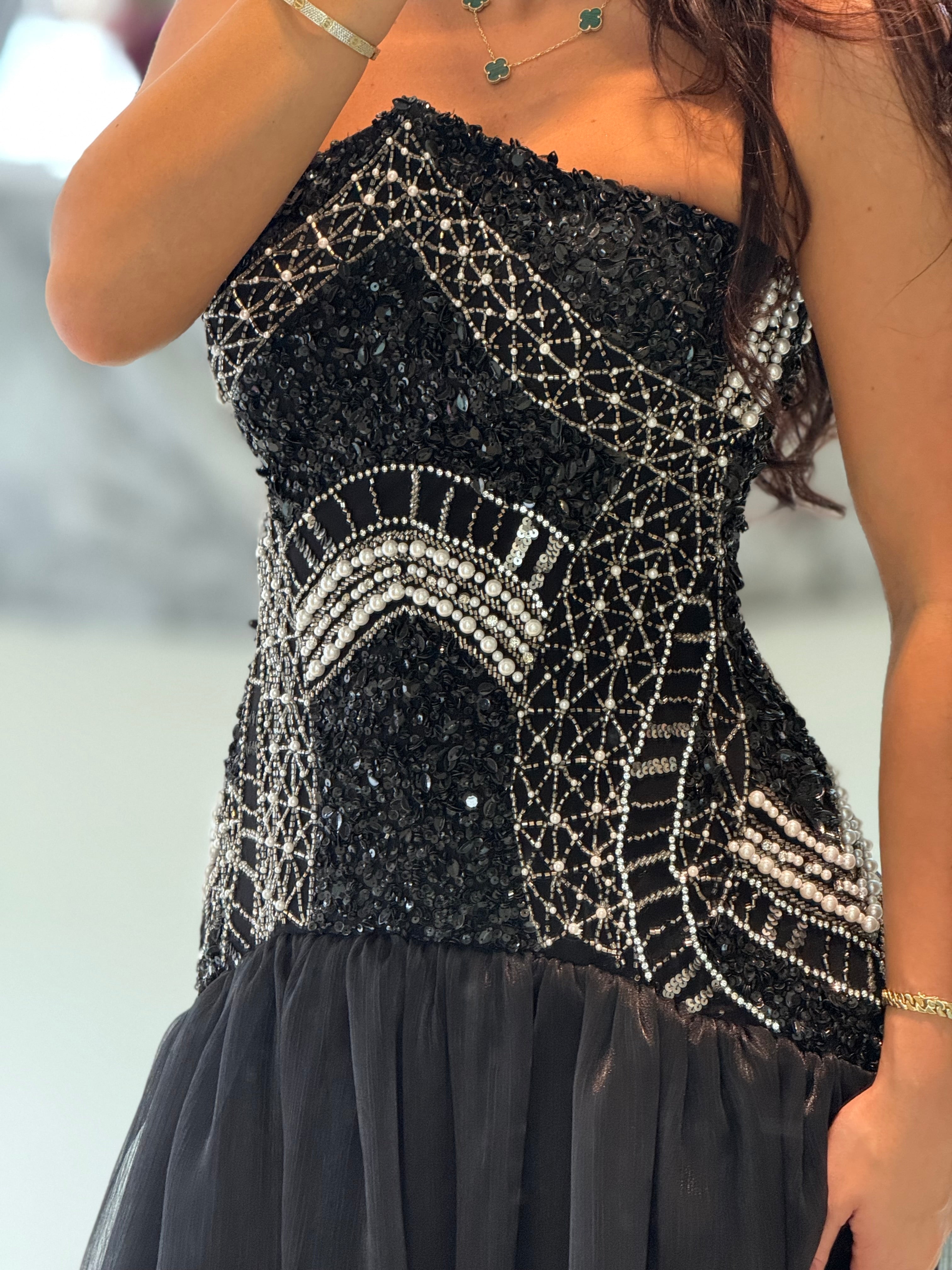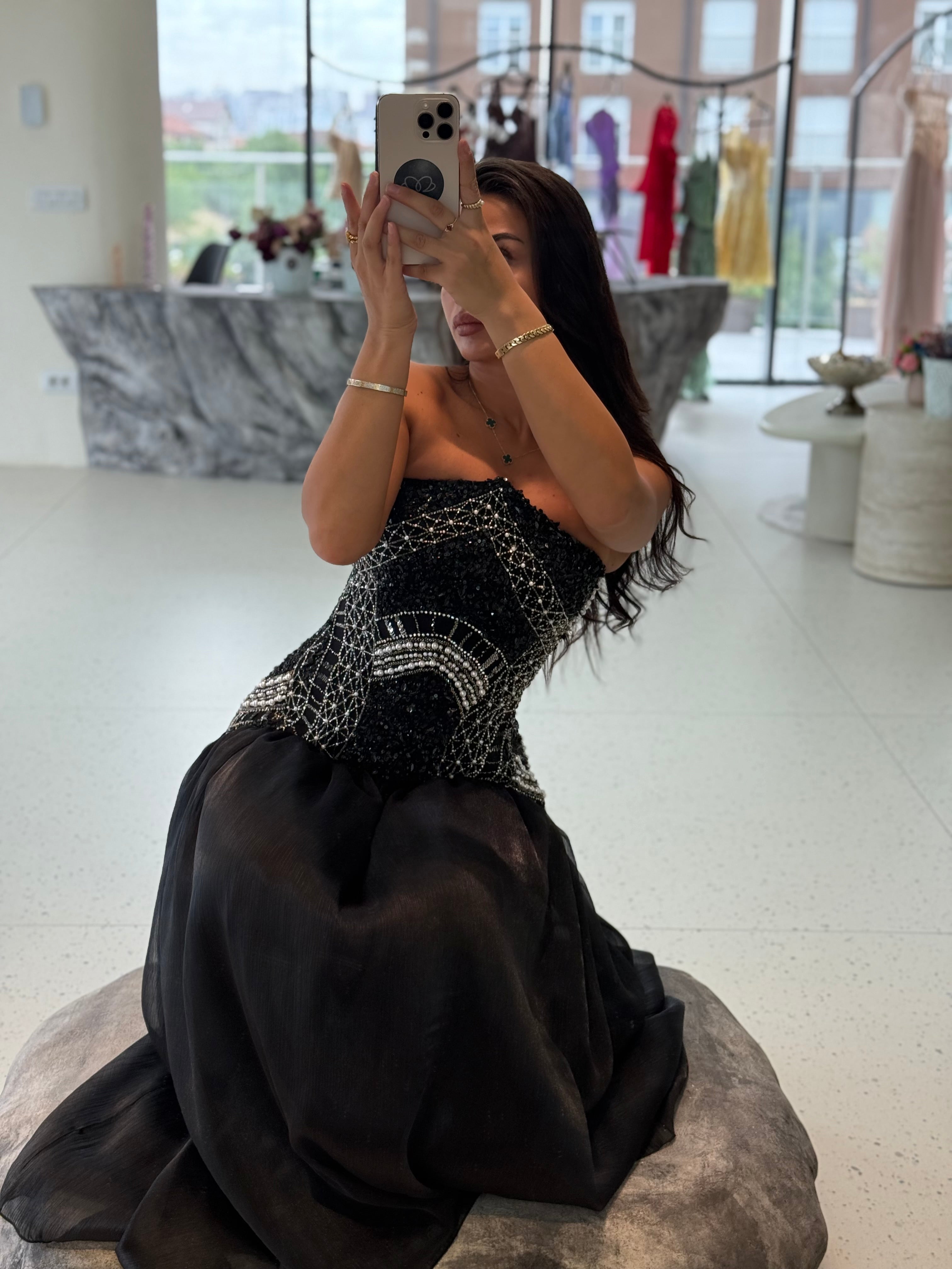 -It uses organza and lace covered with lots of beads, mixed stones, with an interesting shape that emphasizes the corseted waist in the best way.