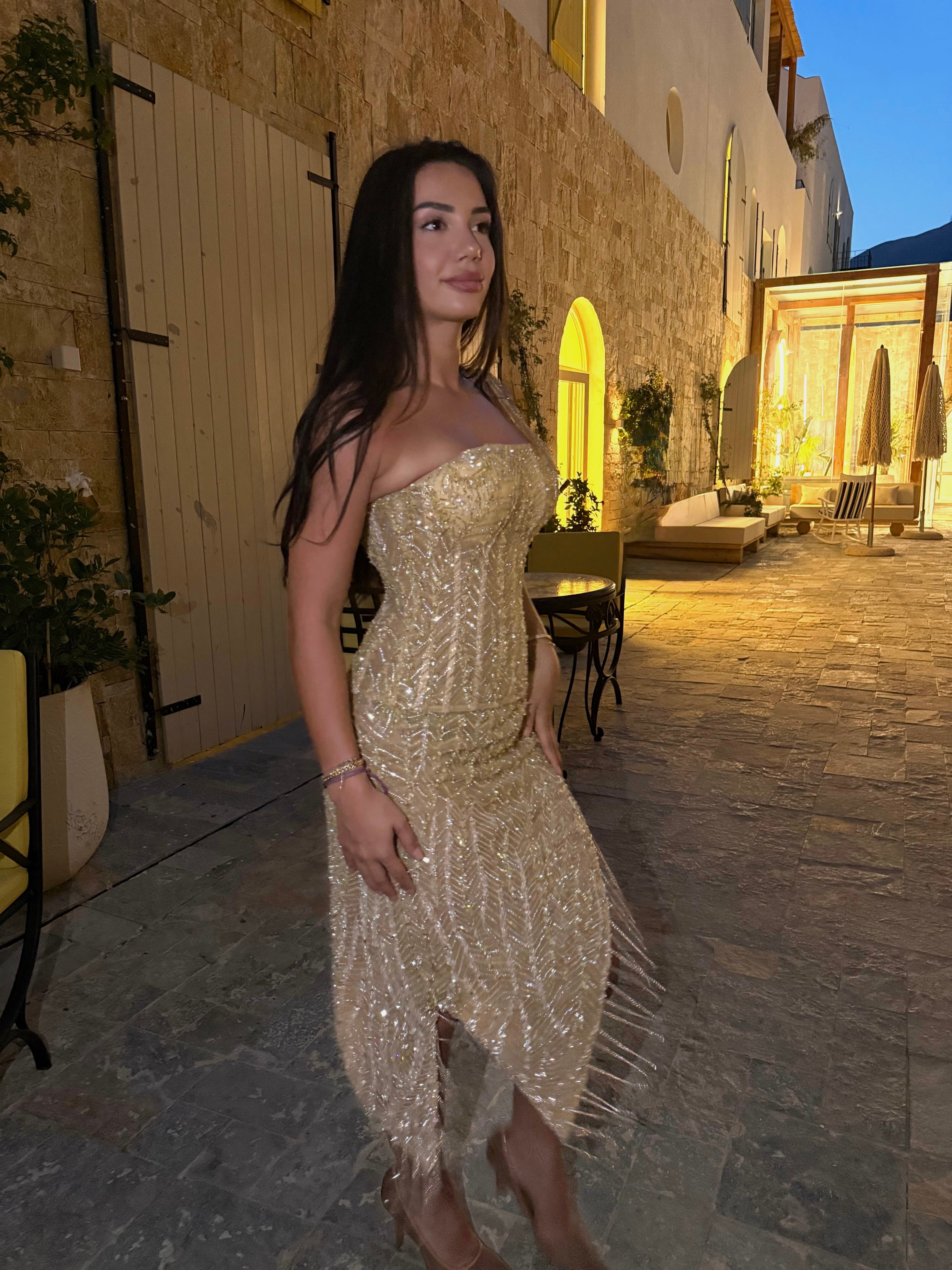 This stunning champagne-colored set is designed for nights that demand sparkle and elegance. Handcrafted with a corset that hugs the body perfectly.