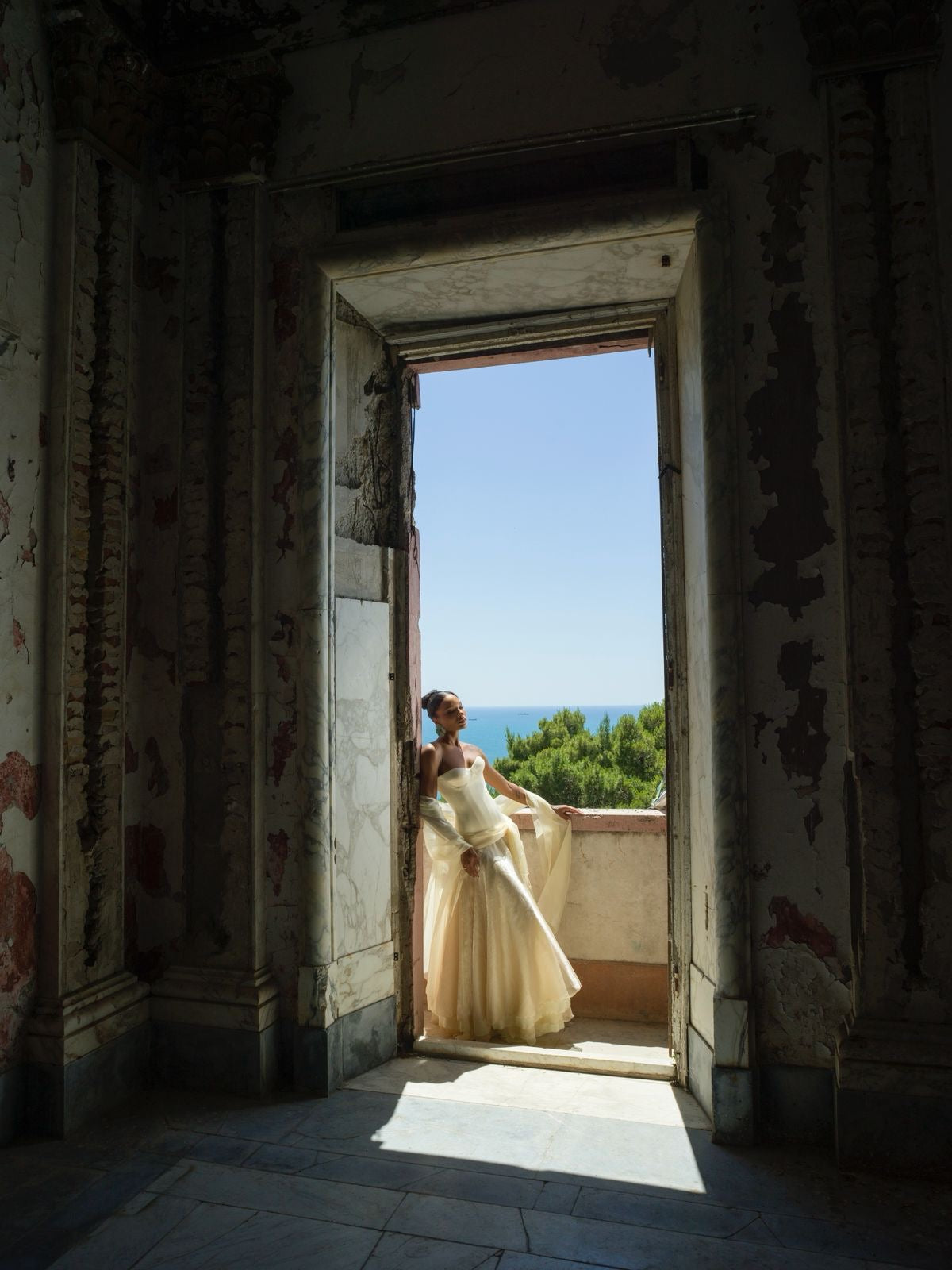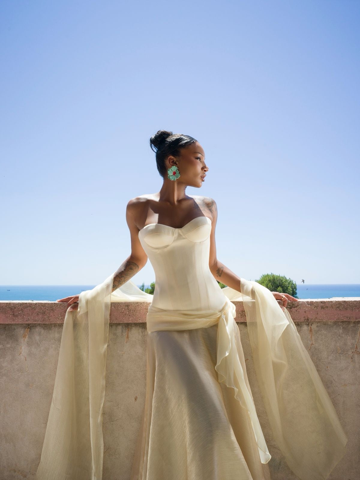- Crafted with a long, accentuated corset, with organza which creates a free and graceful movement.