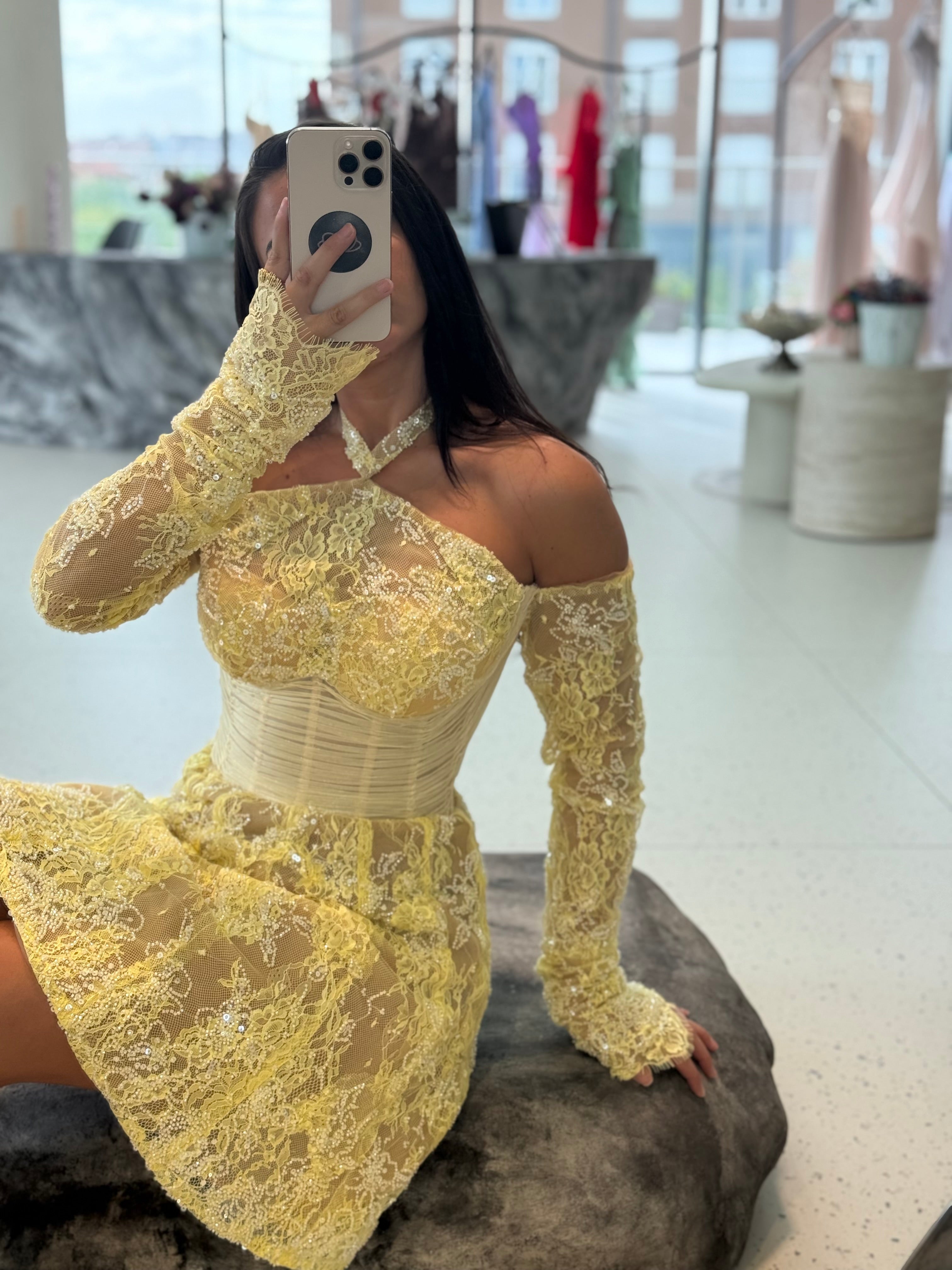 -It uses the familiar and very on-trend yellow beaded lace, with a corset that accentuates the waist.